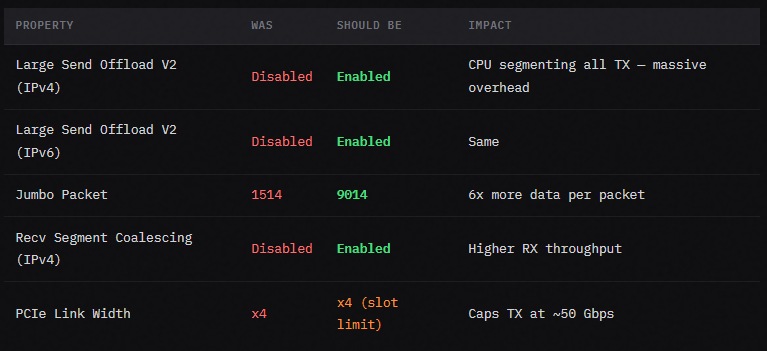 While diagnosing, we also found several NIC properties on the ConnectX-5 that were misconfigured: