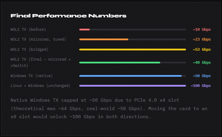 WSL2 mirrored mode with an external vSwitch present outperforms mirrored mode without one. Even though mirrored mode doesn't directly use the external vSwitch, its presence changes how Windows routes traffic from the WSL2 virtual NICs to the physical hardware. The effect was significant: 23 Gbps -> 40 Gbps.